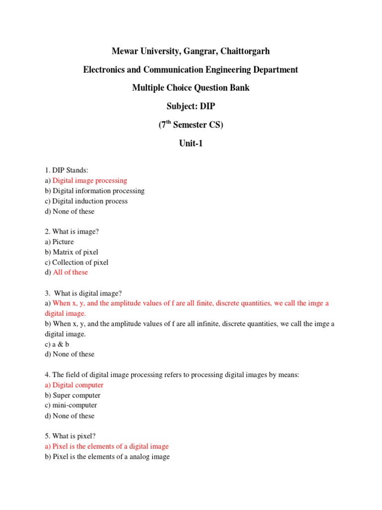 Digital Image Processing MCQ Quiz Take Digital Image Processing Quiz To test your Knowledge Below are few Digital Image Processing MCQ test that checks your basic knowledge of Digital Image Processing. Digital Image Processing Multiple Choice Questions and Answers MCQs. Download Digital Image Processing Notes PDF syllabus for B Tech BCA MCA 2021.