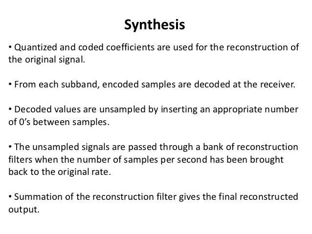 The Moving Picture Experts Group MPEG has proposed anaudio coding scheme which is based on subband coding There are three layers in which layer 1 and layer 2 both use abank of 32 filters. 2-D sequences and systems. One for each of the two transform coefficients y0 and y1.
