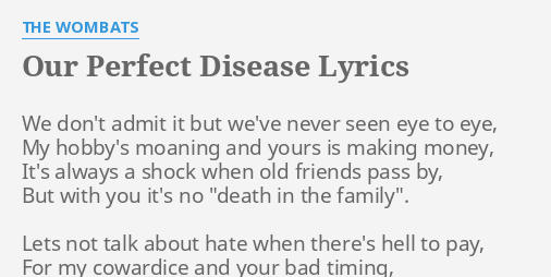 And locking it somewhere it cant get ripped out. The Wombats Our Perfect Disease Lyrics We dont admit it but weve never seen eye to eye my heartbeats moaning and yours is making money Its always a shock when old friends pass by but with you its no death in the family Lets not talk about hate when. You are at. Play our perfect disease tabs using our free guide. Our Perfect Disease The Wombats. Lets not talk about hate when theres hell to pay. Our Perfect Disease Wombats The Lyrics and Our Perfect Disease Wombats The Lyrics from all Our Perfect Disease Wombats The Lyrics. I need you on the train. Lyrics for Our Perfect Disease by The Wombats.